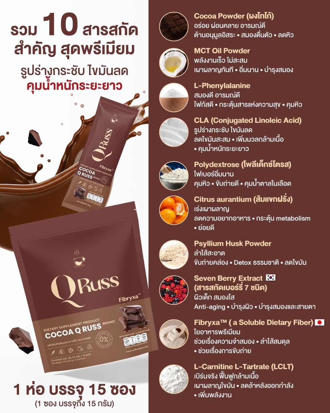 โกโก้ Q Russ ผสานสารสกัดและสารอาหารสำคัญหลายชนิด เพื่อดูแลสุขภาพแบบองค์รวม ทั้งรูปร่าง ระบบขับถ่าย สมอง อารมณ์ และผิวพรรณ เพิ่มการเผาผลาญ ลดความอยากอาหาร และอิ่มนานอย่างสมดุล